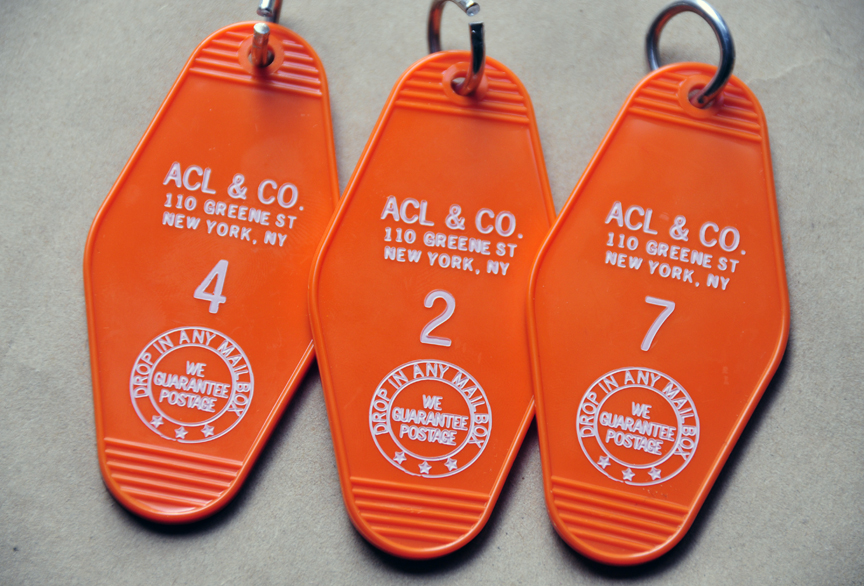 A long awaited package arrived last week to my delight. The contents of which were a batch of customized promotional items that I have long loved – the diamond shaped motel key chain. A few companies still produce these things as cheap give-aways, but I managed to find a company in Wisconsin that still manufactures them for hotels / motels. I haven’t been to a motel with an actual key in like 20 years, so I’m not sure who is actually still using these things. All that aside I was happy to find them and quickly (some would say impulsively) had a batch of 500 made in ACL’s signature orange. It was funny, the form said “enter the room numbers that you would like to have made,” so apparently my hotel has 500 rooms!