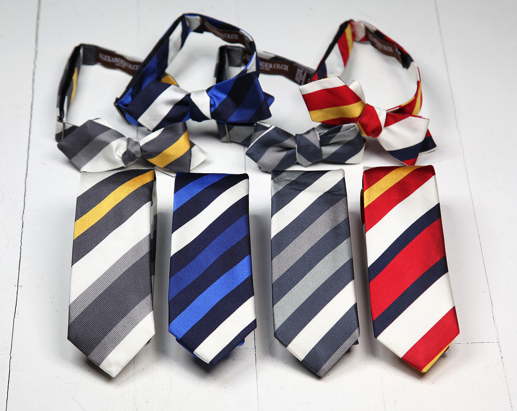 We at ACL & Co. teamed up with our designer & filmmaker friend Alexander Olch to create a small collection of repp stripe neckties and bowties for spring. The repp stripe patterns and colors are inspired by an old men’s shop catalog from the early 1960s and remade exclusively for the ACL & Co. by a mill in England. All eight different silk ties were then handmade in Alexander Olch’s factory in Brooklyn, New York to exacting standards that one has come to expect from an Alexander Olch production.