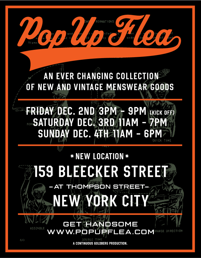 It’s that time of year again, Pop Up Flea time. Come December 2nd, 3rd and 4th we will be holding the fourth edition of our menswear market of desirable new and vintage goods – and all are welcome. We’re excited to release the brand line-up soon, but until them know that we are going to have a lot of the great folks from previous PUFs, and a bunch of great new labels. This could be dangerous – hide your kids, hide your wallet, hide your wife.
