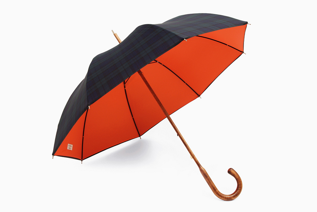 Last year Jamie Milestone (of London Undercover) and I first collaborated on a Black Watch plaid and orange cashmere scarf a scheme I lauded as “world’s greatest color combination.” Well, we didn’t have any intention at stopping at a simple scarf. So this year we got together and made up another collab, but one closer to London Undercover’s roots. We took the same wonderful color combo and made a limited edition London Undercover x ACL & Co. umbrella. Along the way, we’ve basically discovered that everything looks better in Black Watch and orange, this not being the exception.