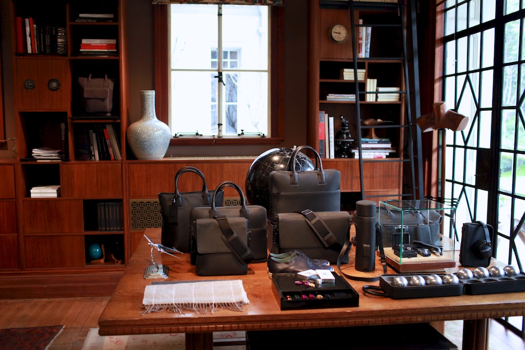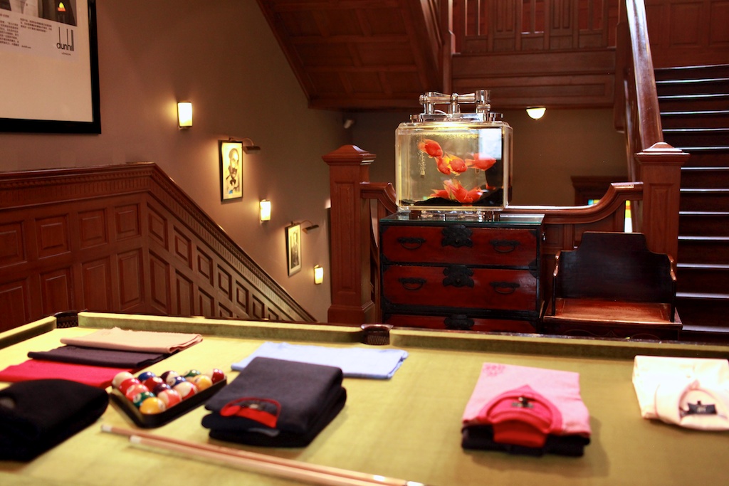 The Dunhill portion of the Twin Villas occupies the first two floors with various rooms representing different categories of finely made goods. Leather bags, travel accoutrements and small items on the ground floor, bespoke tailoring upstairs with the bar and the sportswear rooms. Looking around, it feels like Mayfair for the Shanghai locals (or more specifically, like Bourdon House, Dunhill’s home in London), only without the jet lag. Though, if you fly in to China from New York, Mayfair might be a slightly easier journey.