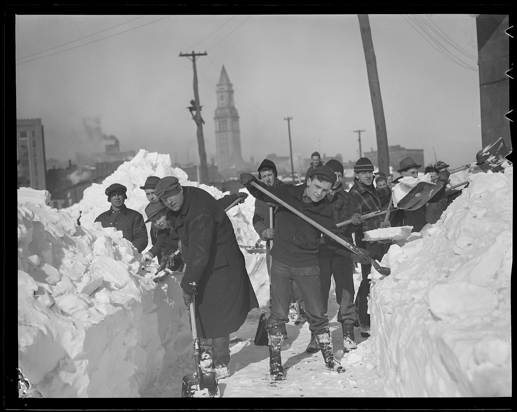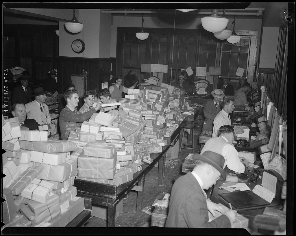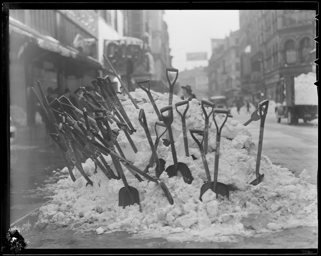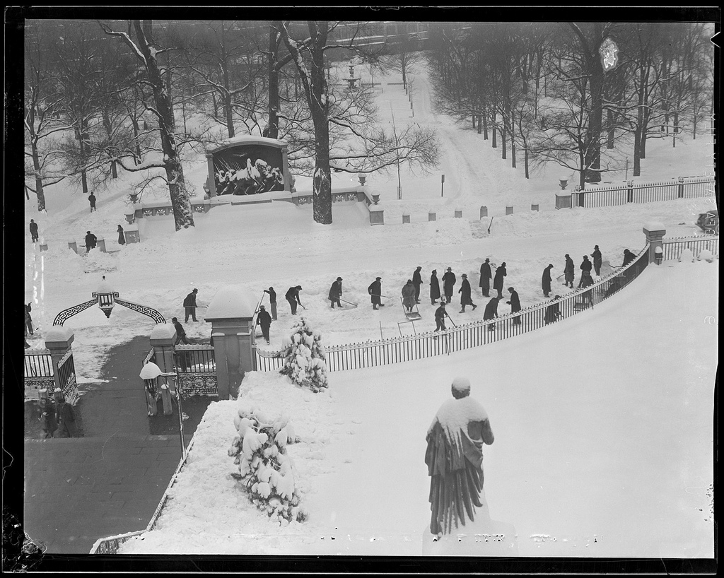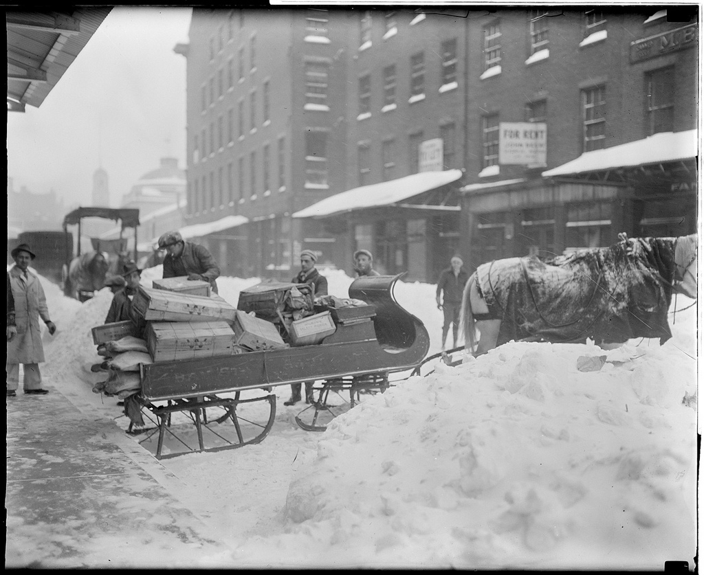 A fitting set of images and sentiments for today. The Boston Public Library has an incredible set of old-time winter scenes shot in and around Boston during the early 20th century. What’s piques my attention in these photographs is the fact that many of the pictured moments are so similar to those of today –from snow filled streets to a towering stack of Christmas trees– though the times are obviously vastly different. To see the packages piled high at the train depot (South Station I believe), the range of photos of people digging out from blankets of snow and the empty nighttime streets after what must have been cold hard days fill me with ideas about what life must have been like way back then.